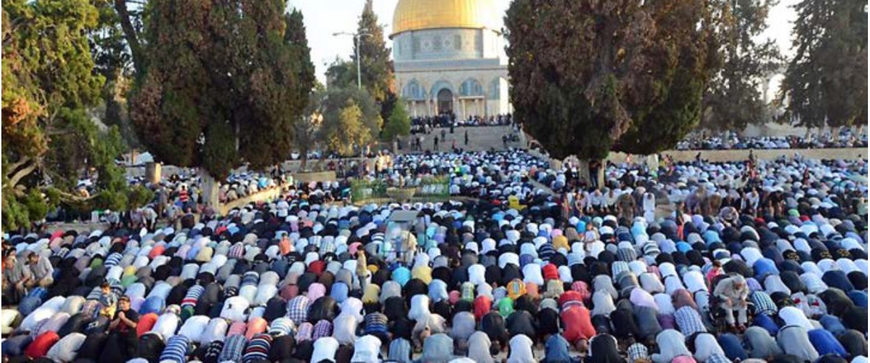 Muslims worship in front of the Dome of the Rock at the end of Ramadan. Jewish prayer here is forbidden.