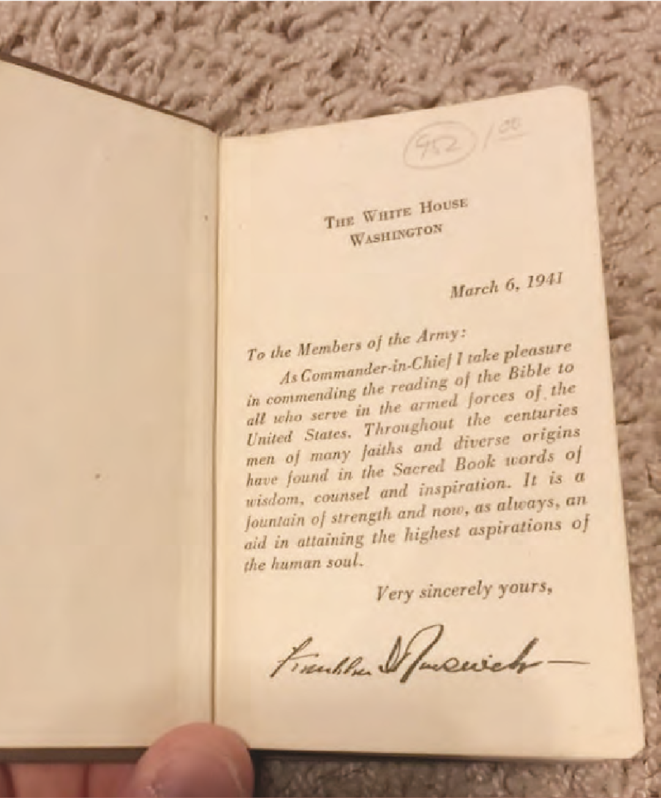 • A miniature Bible printed in 1941 for American troops in World War II and signed by President Roosevelt.