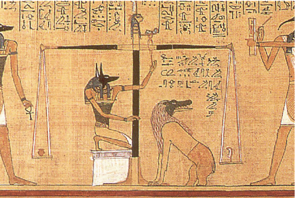 • The heart of a dead man is being weighed in the balance against the ‘feather of truth’ by the jackal-headed god ANUBIS.