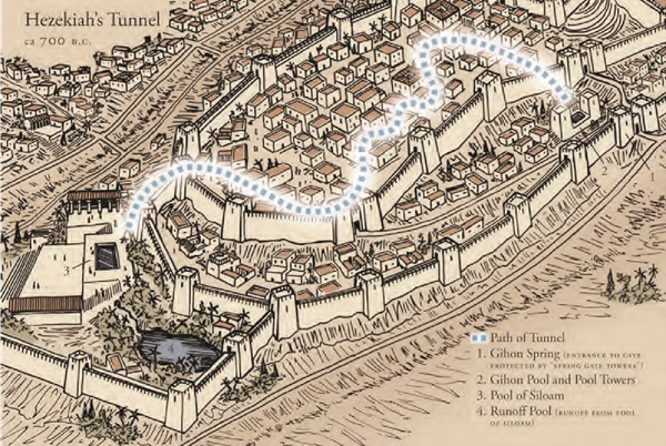 At one time critics of the Bible maintained that the science of engineering was not developed sufficiently at the time of Hezekiah to enable this water-course to be constructed. Today the tunnel has been discovered – it came from outside the old city of Jerusalem into the Pool of Siloam. Near the entrance was an inscription written in the Hebrew characters of Hezekiah's time which records the construction of the tunnel.