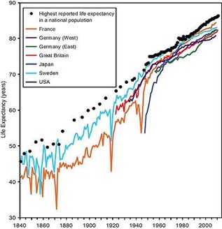 - Chart showing the astonishing increase in human lifespan (nearly a doubling) over the last two centuries in the western world.